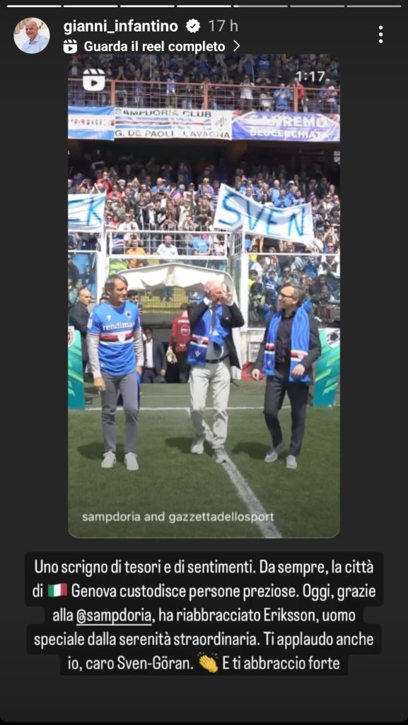 «Uno scrigno di tesori e sentimenti. Da sempre, la città di Genova custodisce persone preziose- Oggi, grazie alla Sampdoria, ha riabbracciato Eriksson, uomo speciale dalla serenità straordinaria. Ti applaudo anche io, caro Sven-Goran. E ti abbraccio forte».