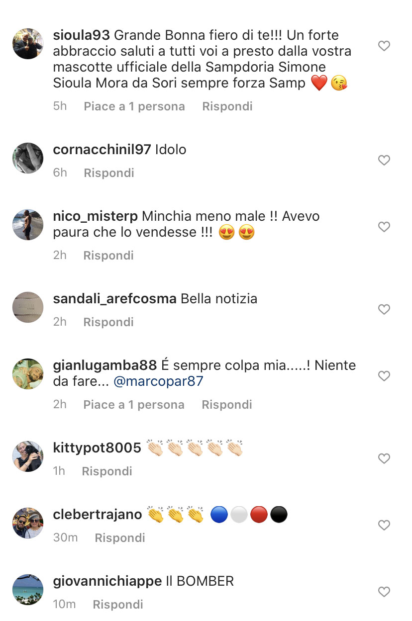 È tanta la soddisfazione e molti auguri per il futuro da parte dei tifosi blucerchiati. Tra i commenti sui social, dove spicca quello di Fabio Depaoli, diverse richieste di gol nella stagione 2020/21.
