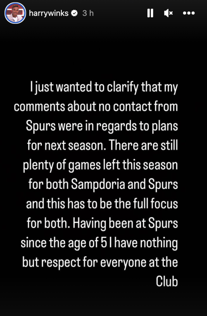Harry Winks ha voluto chiarire le recenti dichiarazioni rilasciate sul Tottenham. Il centrocampista inglese, attualmente in prestito dalla Sampdoria, ha ammesso di non essere in contatto con alcun componente della società inglese. Salvo poi specificare, via Instagram, che le sue affermazioni si riferivano ai progetti per la prossima stagione.